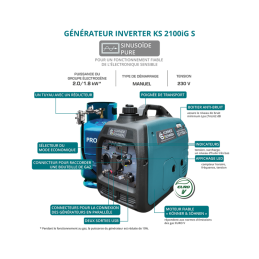 Le groupe électrogène portable KS 2100i S du TM allemand «Könner & Söhnen» est une source pratique d’énergie électrique possédant un boitier de protection insonorisé. L’unité électronique intégrée contrôlée par microprocesseur assure le travail correct du générateur et fournit une fréquence fixe de 50 Hz et une tension de 230V.